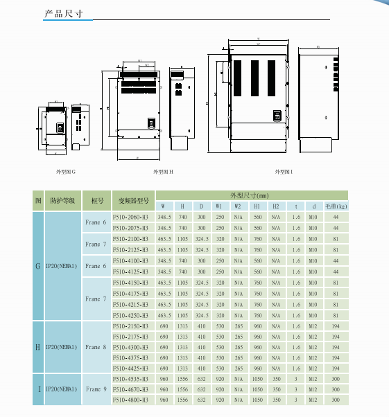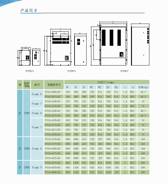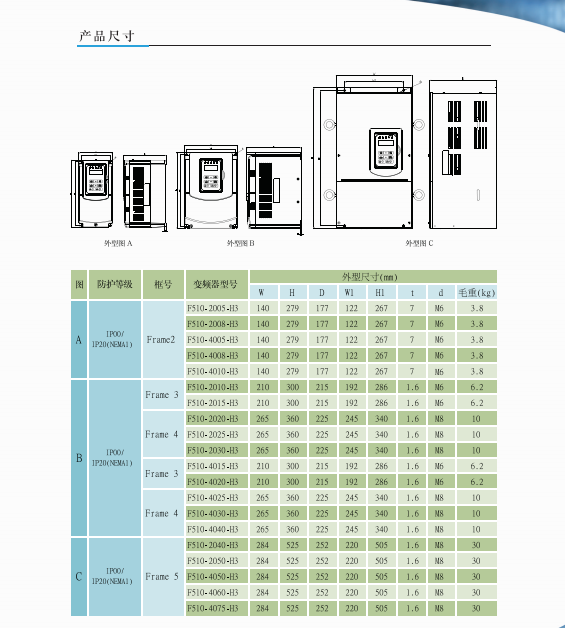 東元臺安變頻器F510停產(chǎn)機型的外形安裝尺寸數(shù)據(jù)圖:
