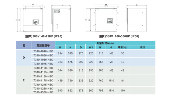 東元變頻器T310外形安裝尺寸數(shù)據(jù)圖:
